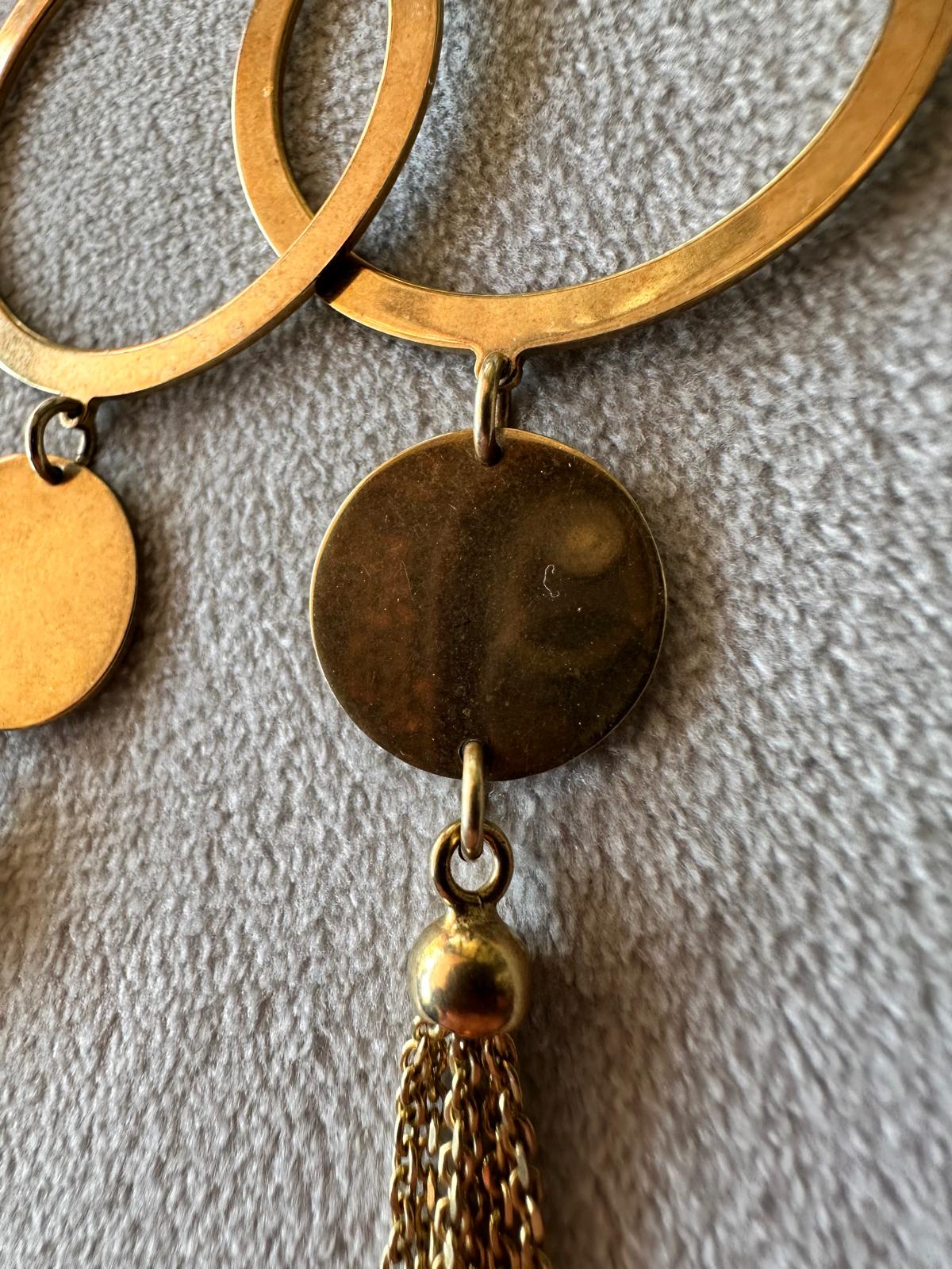Crafted from 925 sterling silver and plated with warm gold tones, these earrings feature a striking geometric design with round elements and delicate tassels.
