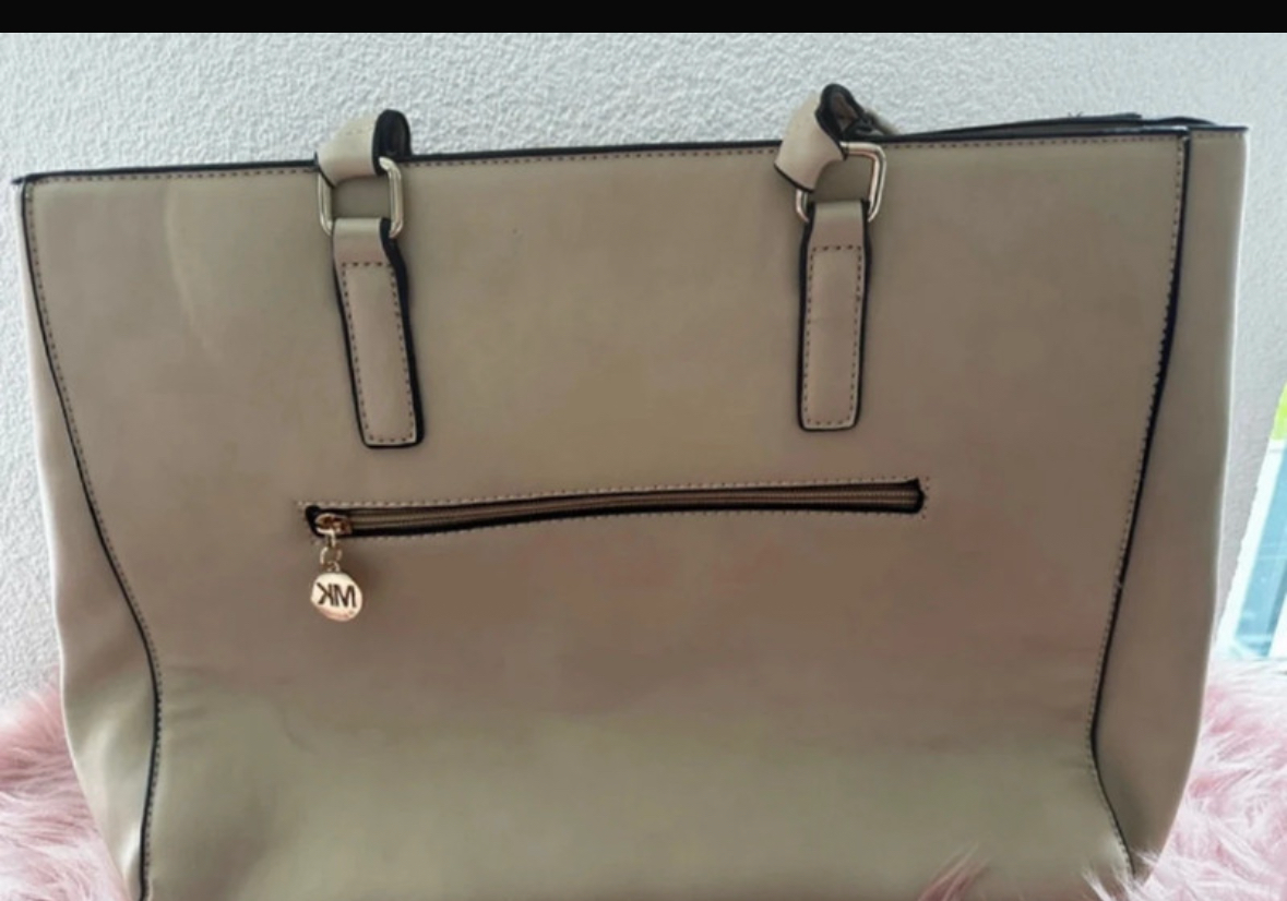 The interior offers ample space and functionality with multiple compartments, a secure zip pocket, and a full lining. Finished with a fluffy faux fur keychain, bead details, and a gold-tone MK tag — because whimsy is always in style.