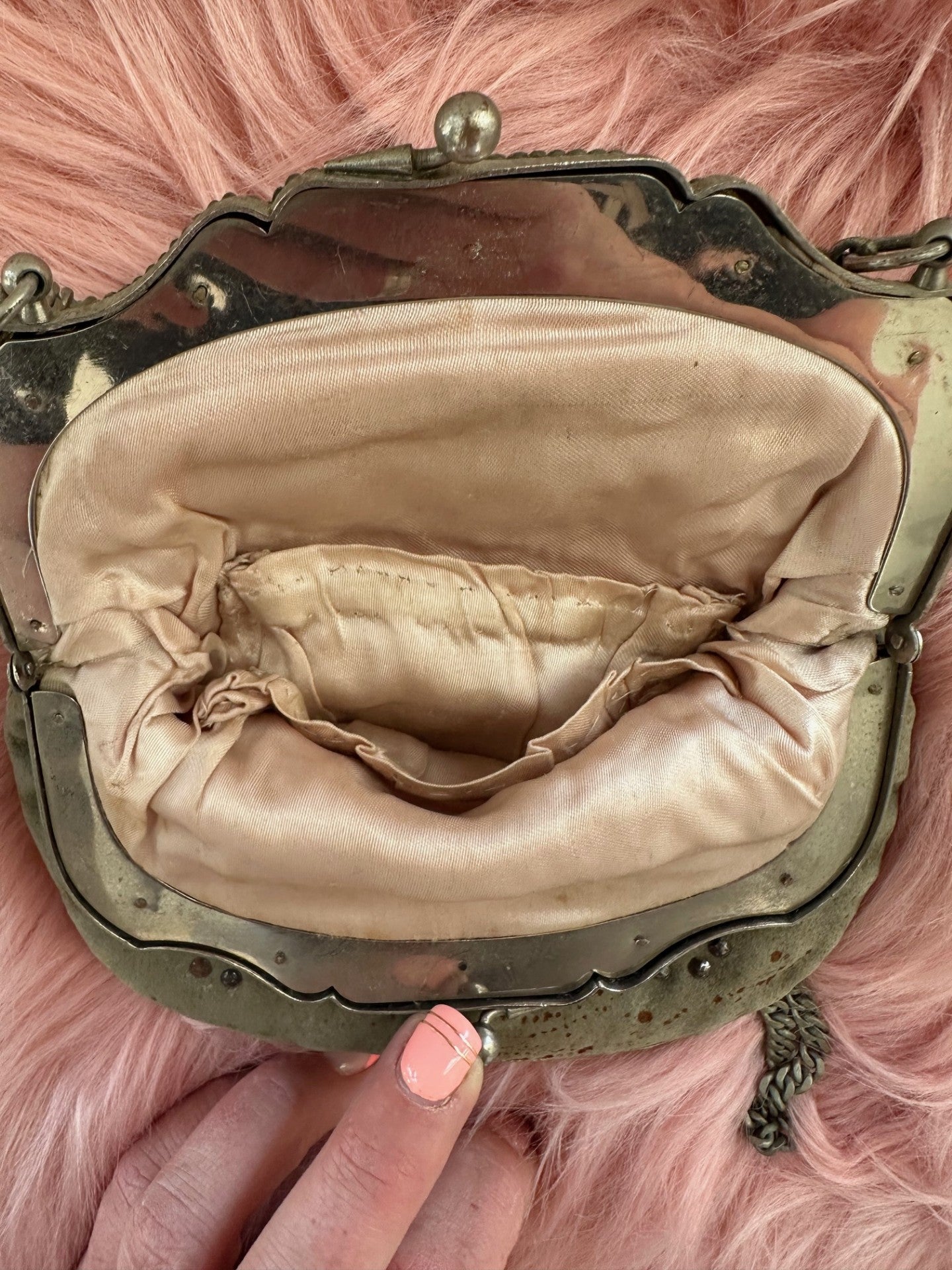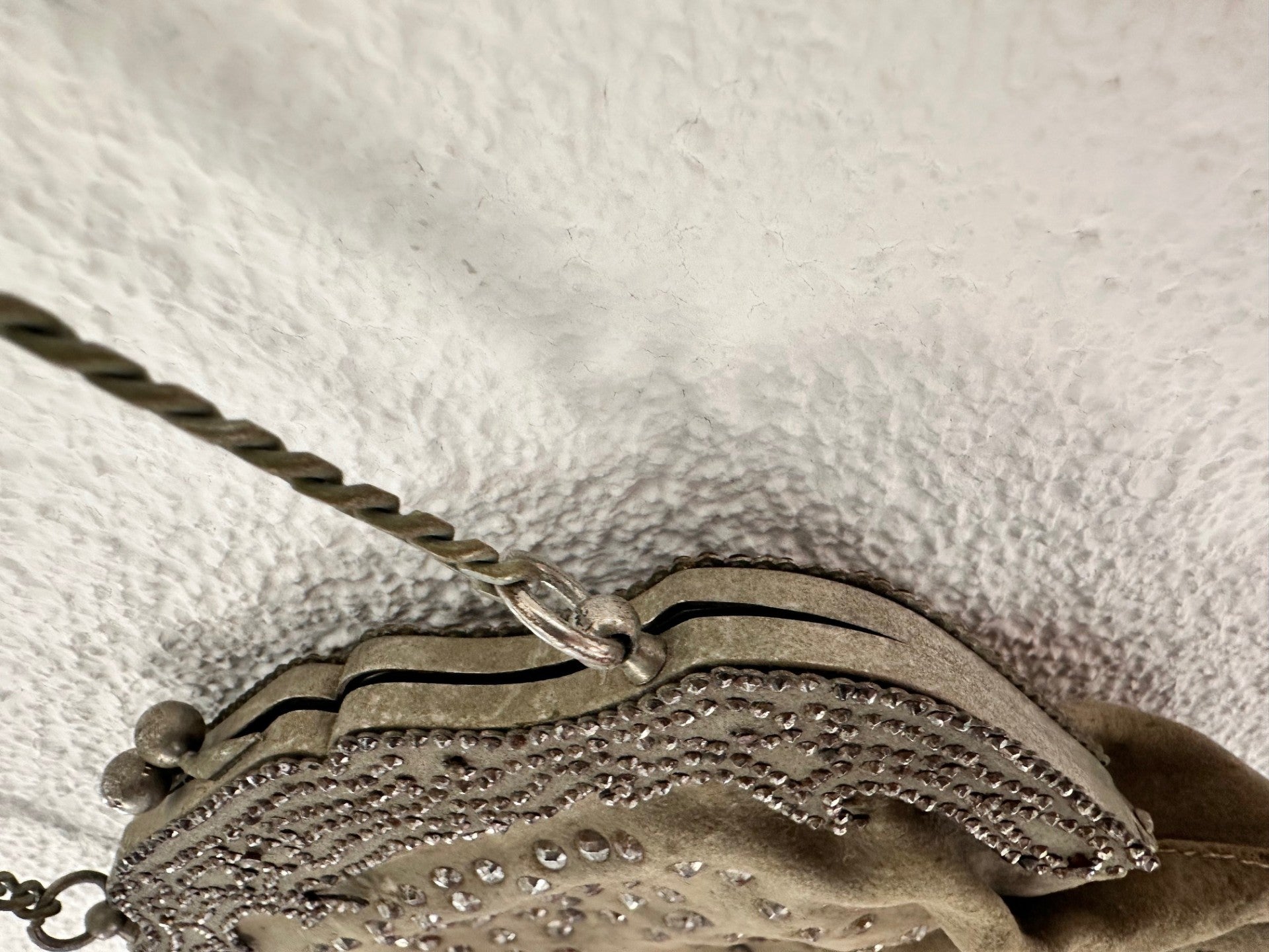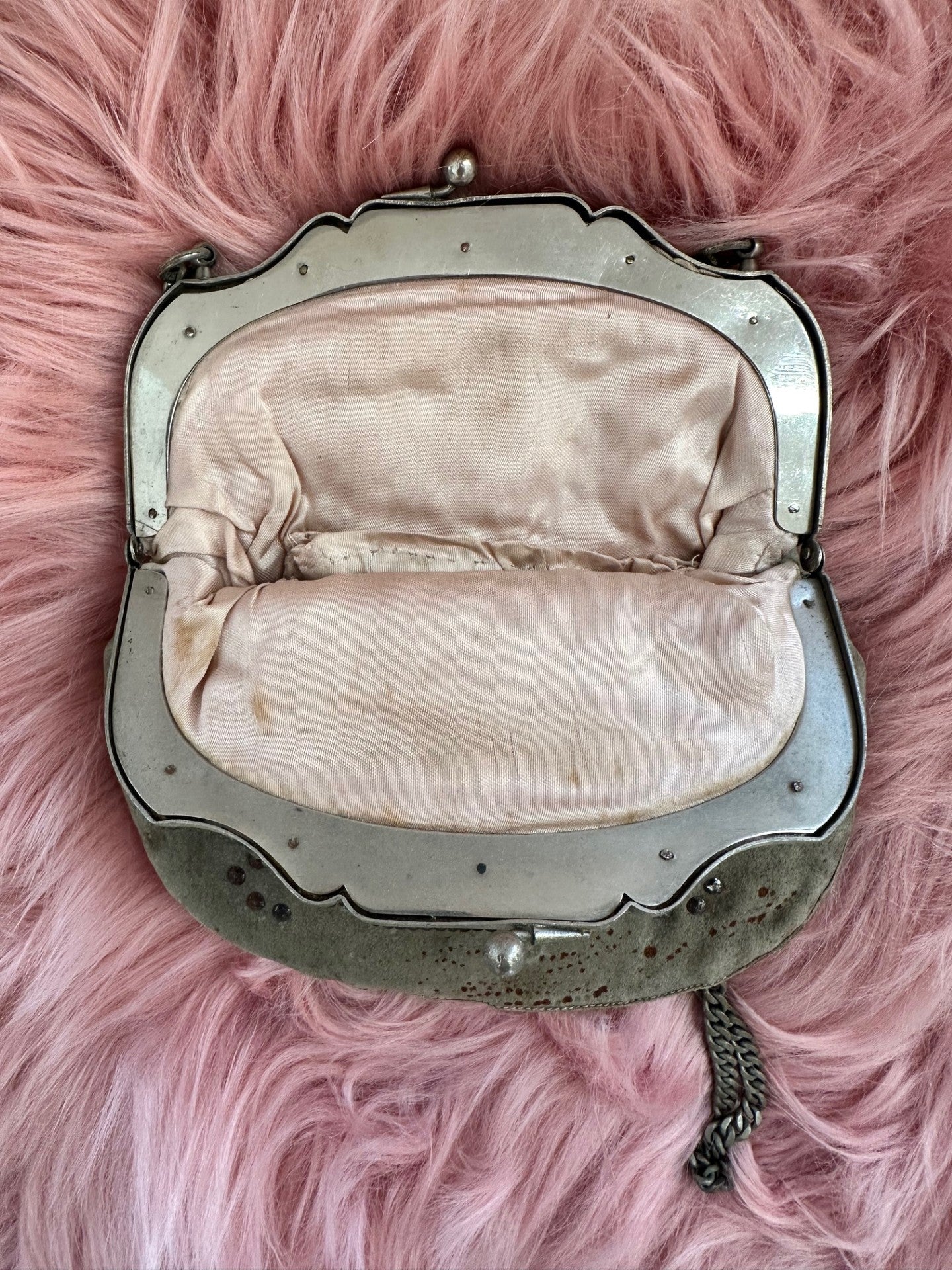 Step back into the glamour of the Roaring Twenties with this exquisite antique evening bag. Handcrafted with shimmering rhinestones and intricate metal beadwork, this petite treasure features a delicate kiss-lock closure and original pink satin lining. The soft, aged suede body is adorned with ornate Art Deco motifs, showcasing the elegance and craftsmanship of a bygone era.
