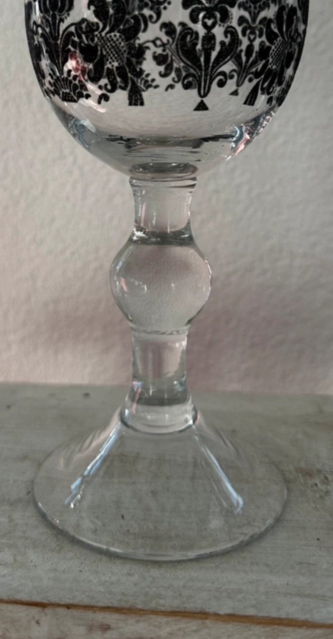 A pair of striking vintage-style wine glasses adorned with an intricate black baroque flock design. The elegant contrast between the clear glass and the velvet-like pattern evokes a sense of timeless drama and sophistication.
