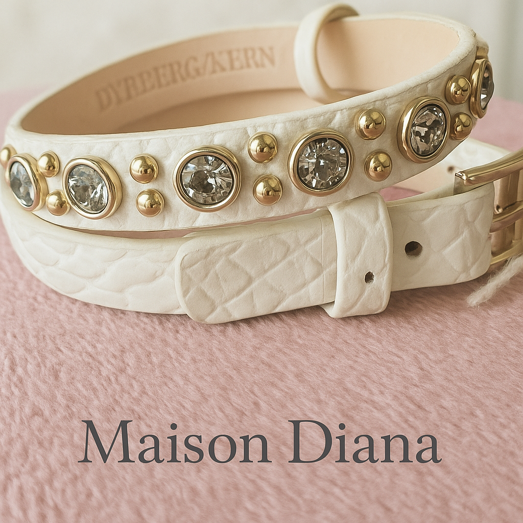 Step into refined elegance with this original Dyrberg/Kern choker – a true statement piece from the iconic Danish design house. Crafted from textured white faux leather with a subtle snakeskin pattern, this collar-style necklace features a dazzling array of hand-set clear crystals in silver and gold-tone settings. Golden bead accents add dimension and a touch of glamour, making this a perfect blend of modern edge and vintage luxury.