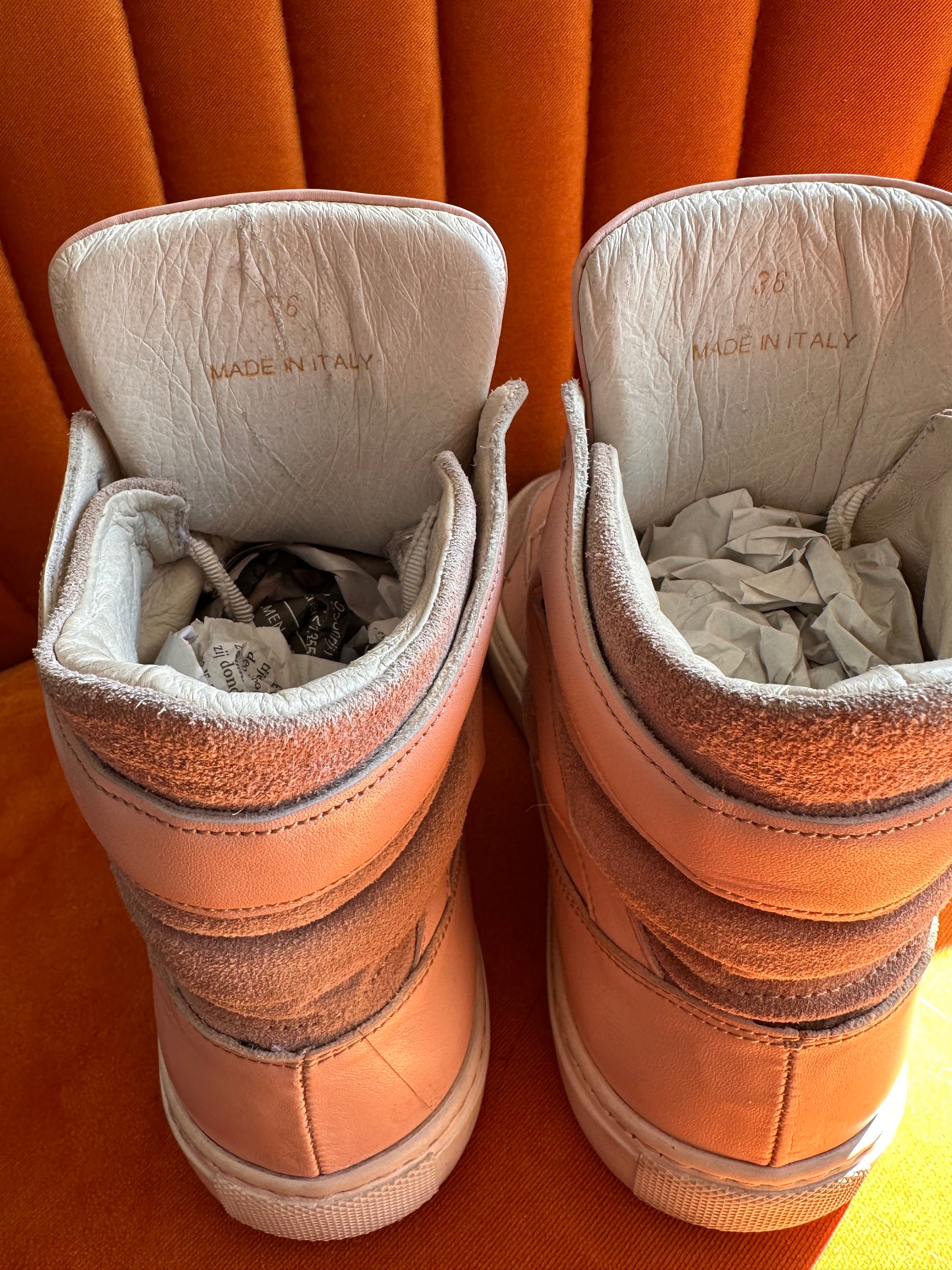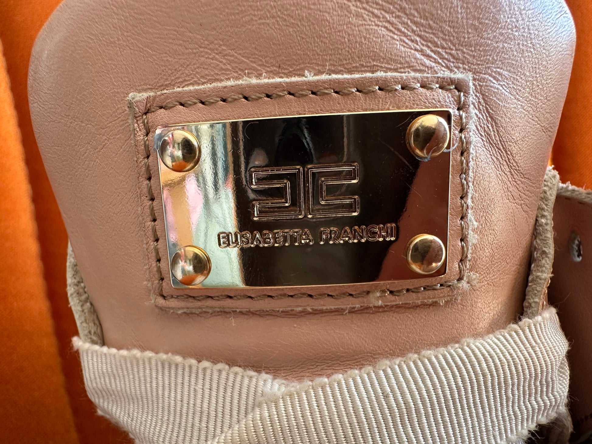 Elevate your wardrobe with a rare find: these stunning Elisabetta Franchi high-top sneakers in a refined rose pink hue. Designed for the modern woman who embraces effortless luxury, these sneakers blend high fashion with a bold, urban edge.