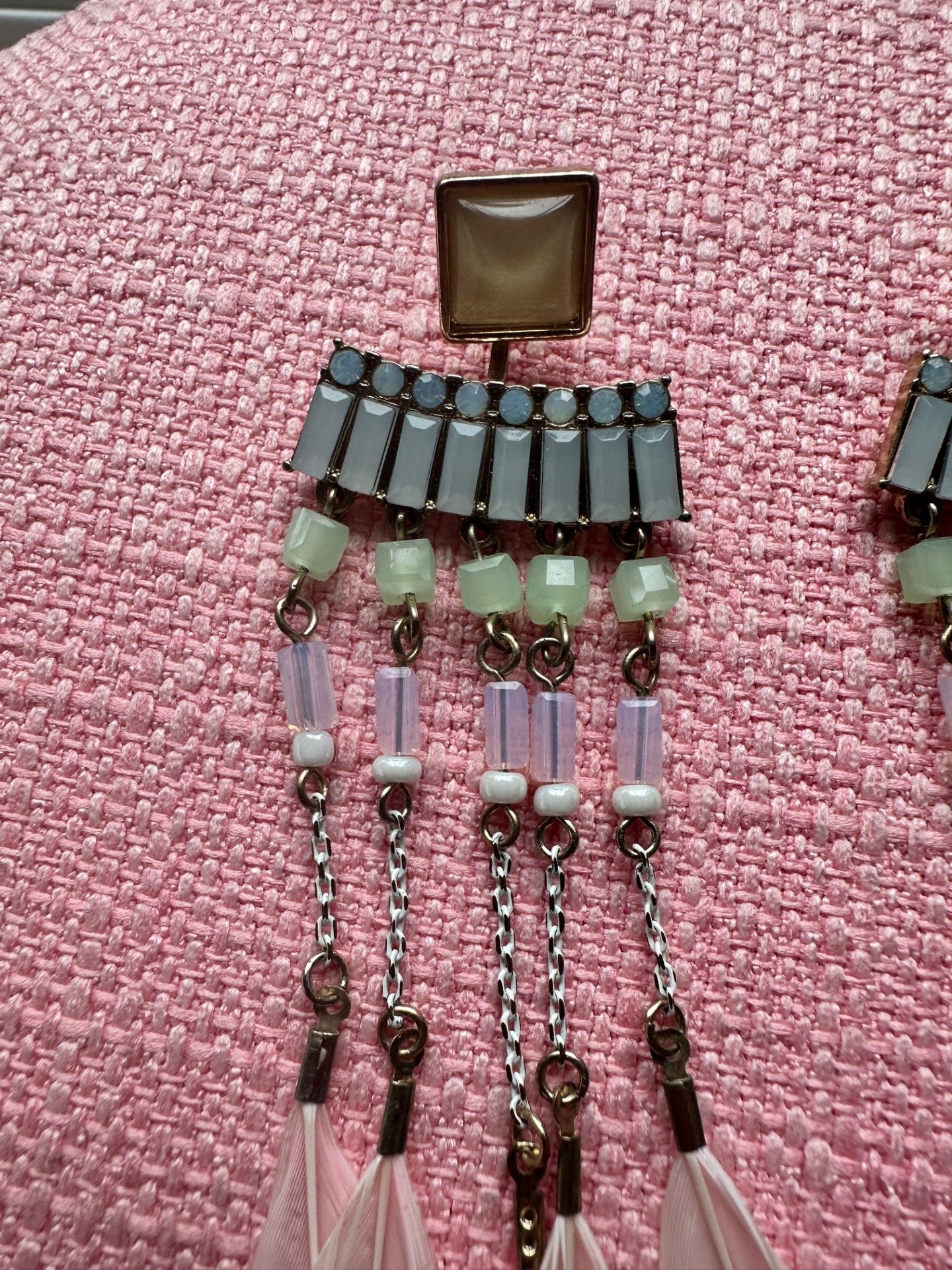 These long, handmade dangle earrings feature soft blush pink feathers, pastel green and lilac beads, shimmering opalescent stones, and a warm golden base. A mix of delicate chains and faceted acrylic gems creates a soft, cascading movement with every step. The subtle shimmer in the top square cabochon adds an elegant finishing touch.