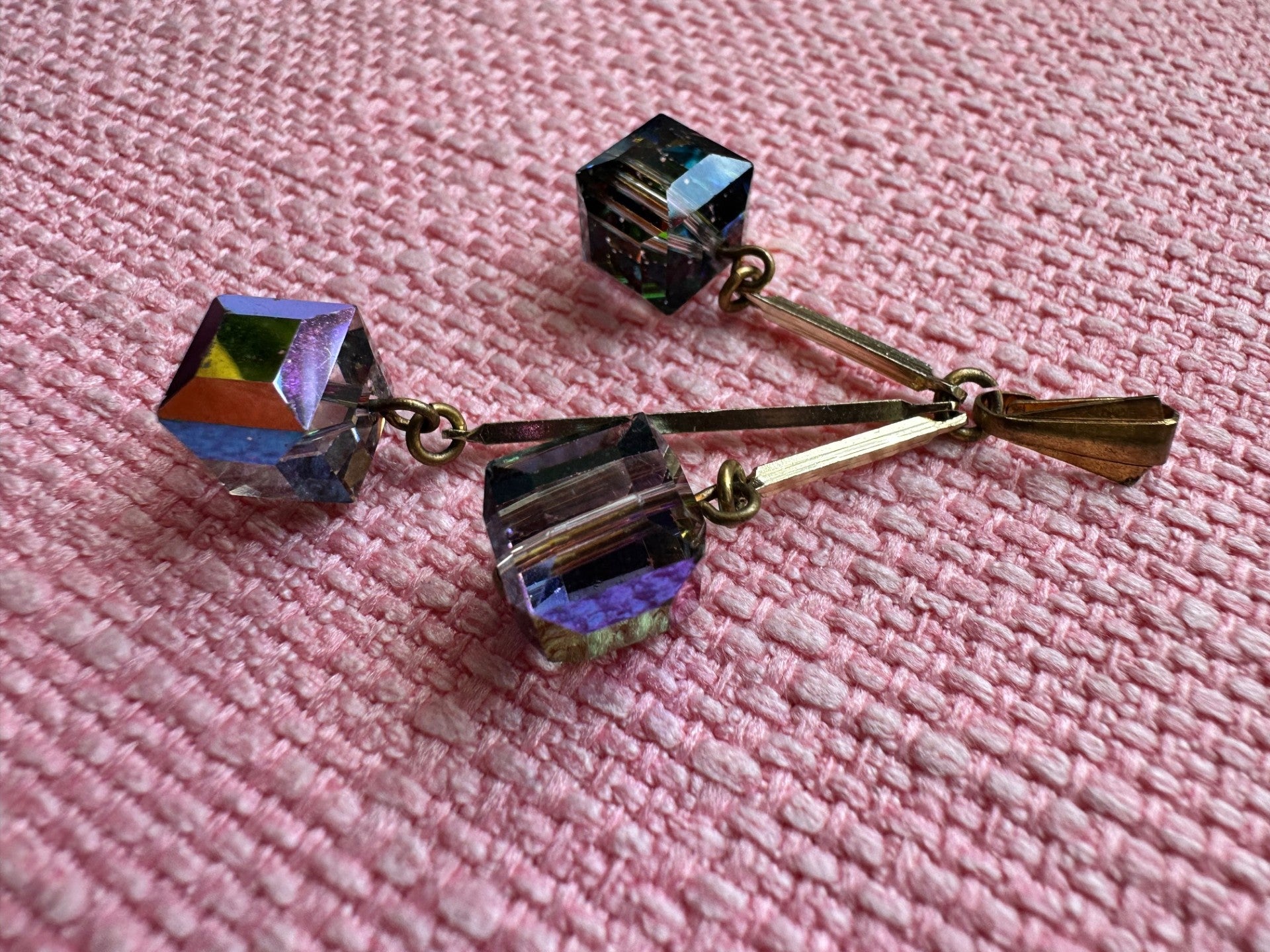 Step into timeless elegance with this striking vintage pendant, featuring three dazzling cube-shaped Aurora Borealis crystals suspended from slender gold-tone bars. The crystals radiate a kaleidoscope of colors—purple, green, blue, and gold—shifting beautifully with every movement.