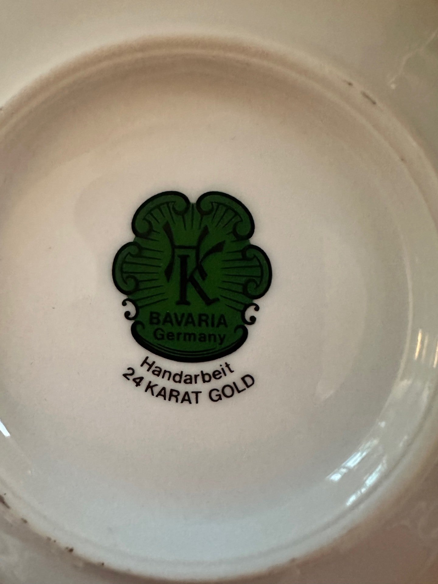 This exquisite set of hand-decorated Bavarian porcelain teacups and saucers features intricate rose motifs and rich 24-karat gold detailing. Crafted in Germany by K Bavaria, each piece is a true testament to old-world craftsmanship and romantic charm. Whether displayed or used, these vintage treasures bring refinement to any table.