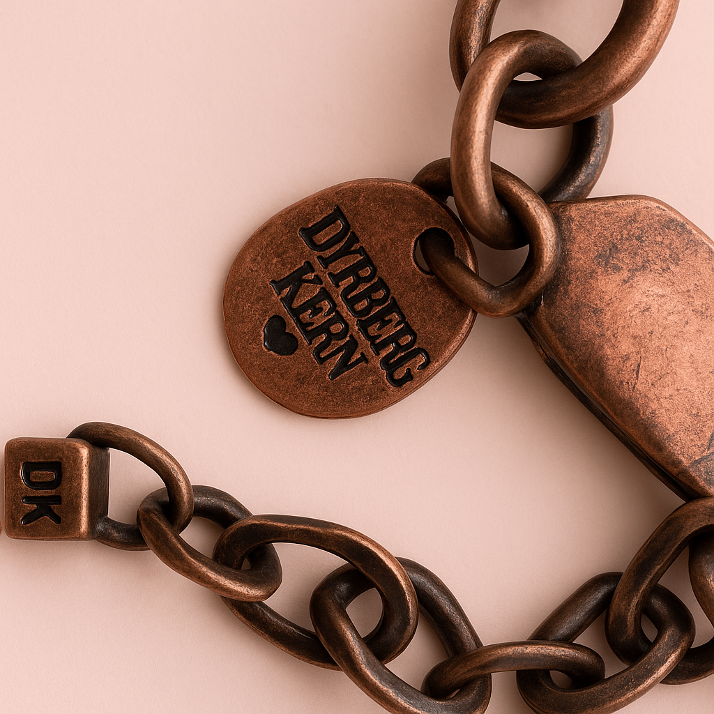 Bold, artistic, and unmistakably unique — this striking necklace by Danish design house Dyrberg/Kern is a true conversation piece. Featuring a chunky antique-copper chain adorned with an eclectic mix of resin drops, glass beads, and shell-like accents in warm amber, burgundy, and honey tones, it embodies boho-chic elegance with a touch of retro flair.