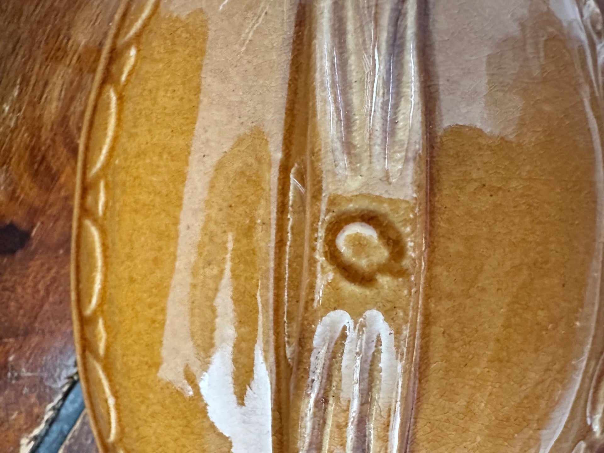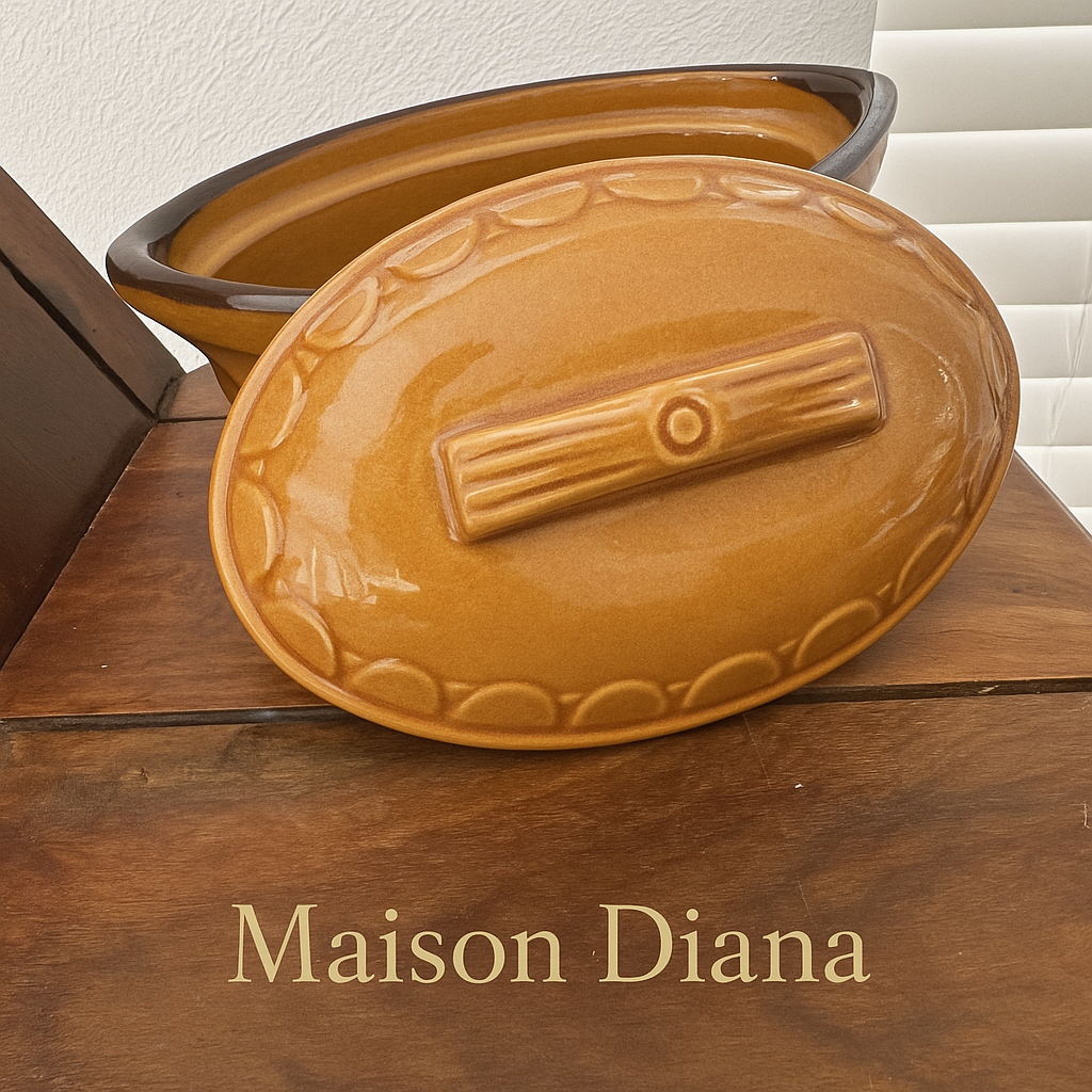 Bring the warmth of French country kitchens into your home with this charming vintage terrine. Glazed in a rich honey-brown tone, this ceramic piece was crafted with care and features embossed decorative details and a matching lid with a rustic handle.